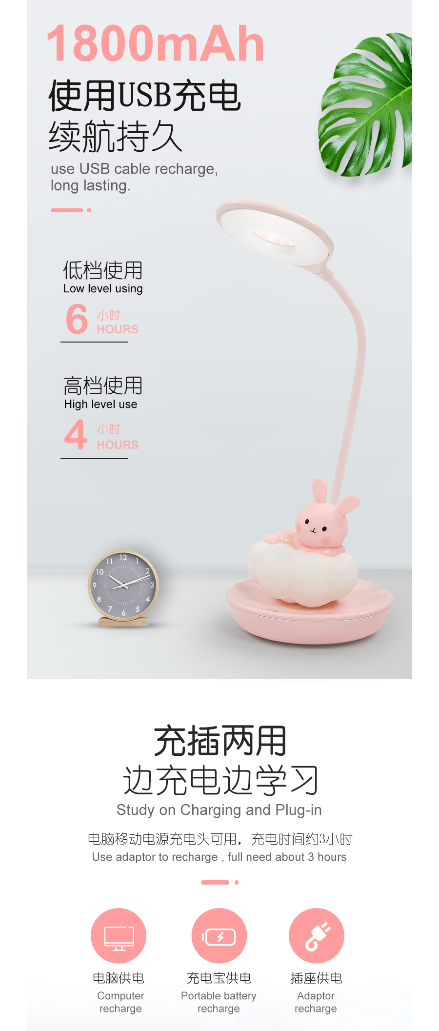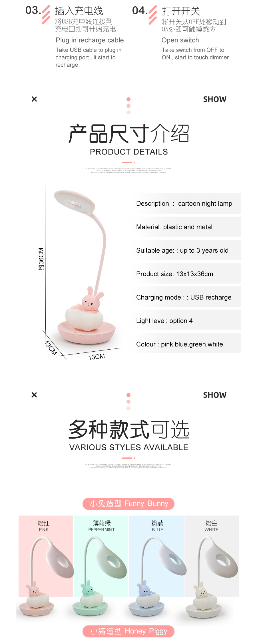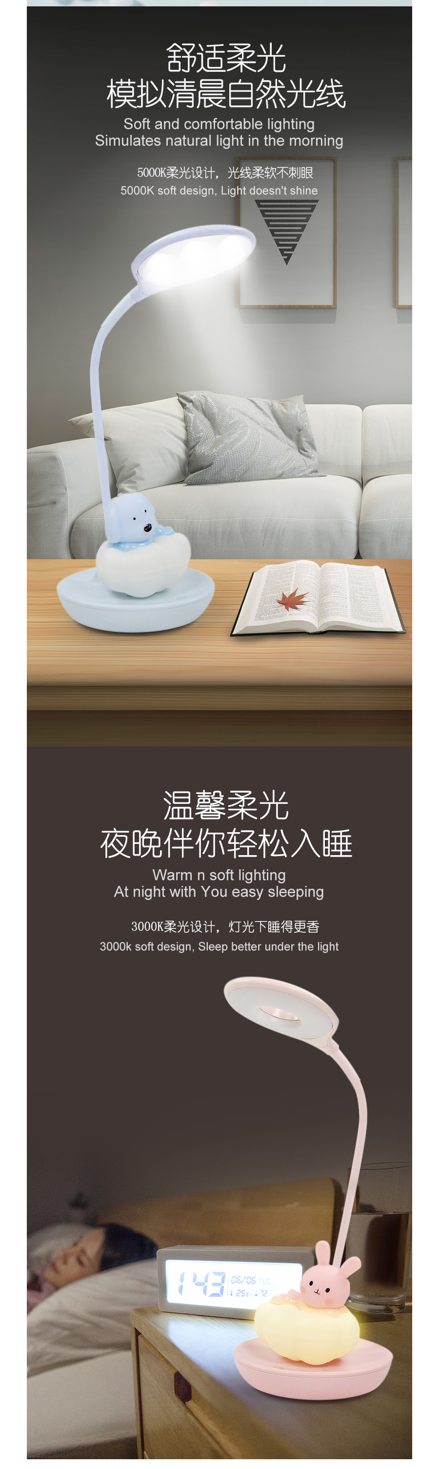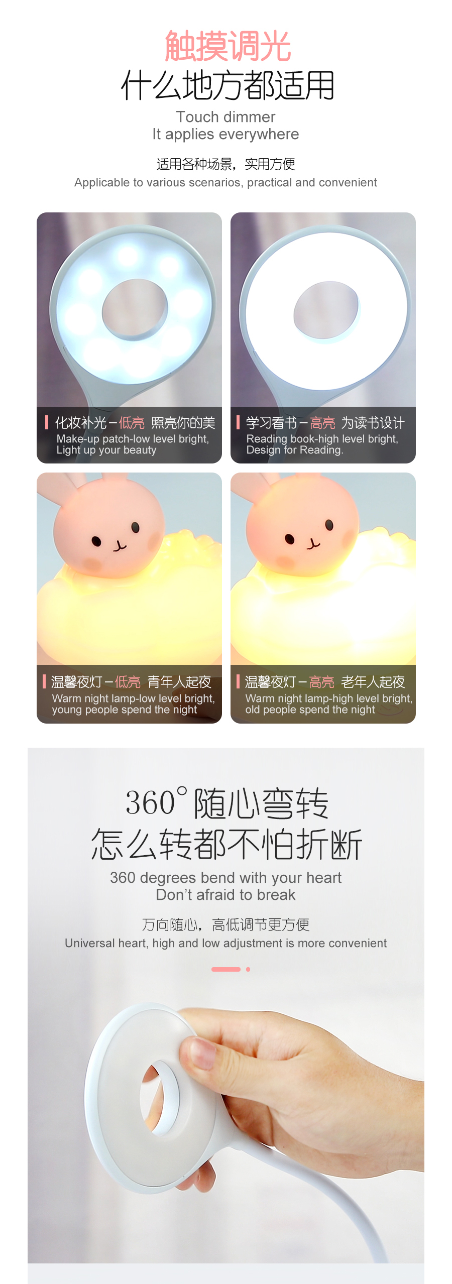 Cloudy Bunny dimmable Touch LED Reading lamp and night lamp with 5 Levels Brightness.