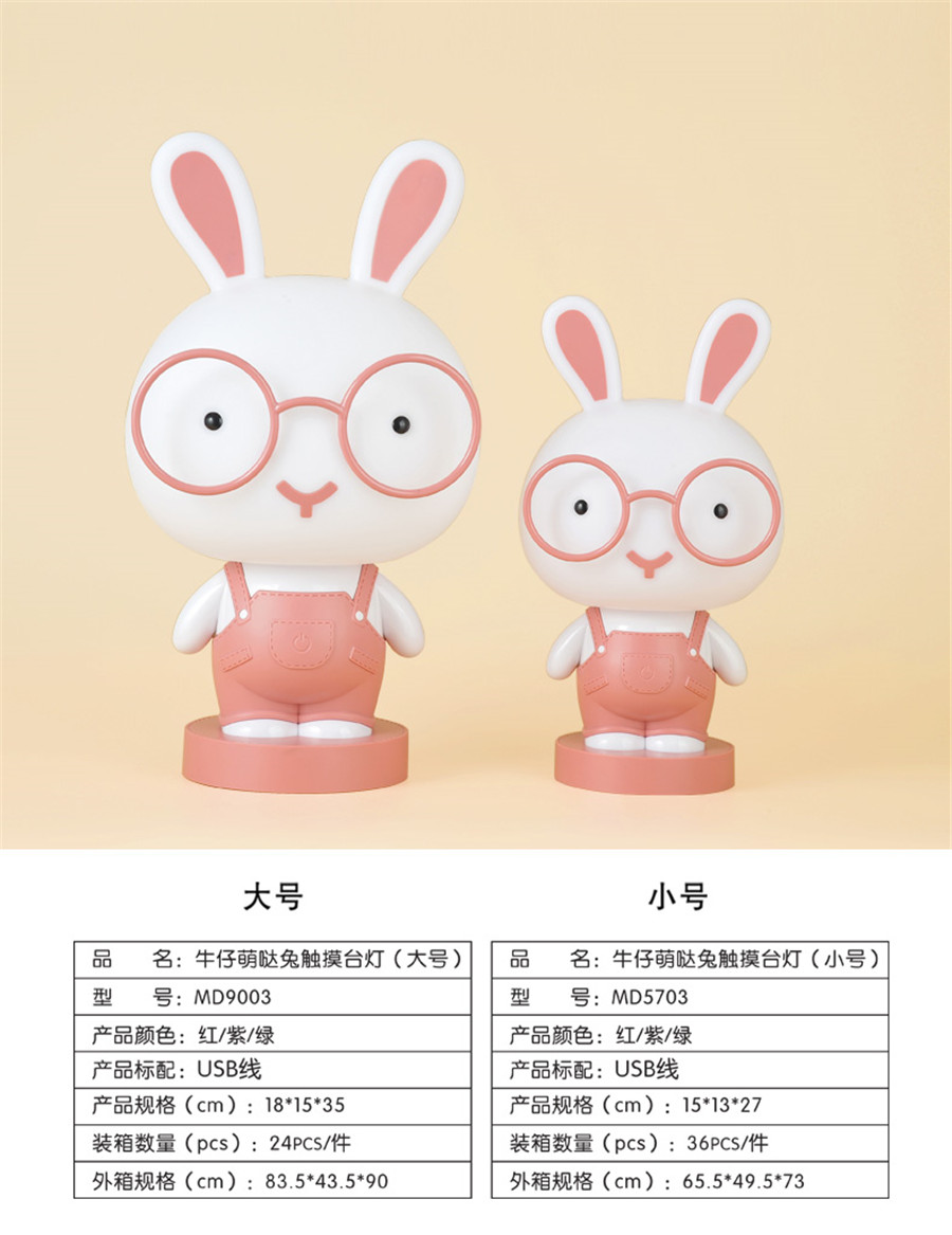 Bunny night lamp,8 level touch dimmer RGB color light and white light,inner recharging Li-battery,with USB recharge cable.